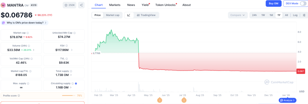 ​The crisis traces back to spring 2025, when MANTRA’s OM token suddenly plunged by about 90%, from roughly 6.3 dollars to below 0.5 dollars, wiping out an estimated 5.5 billion dollars in market capitalization and prompting community suspicions of fraud. Mullin initially attributed the crash to large‑scale liquidations of positions that had used OM as collateral, but a subsequent analysis by on‑chain research group OddEyeResearch alleged that insiders controlling more than 90% of the token’s supply had manipulated the market, deepening the loss of confidence around the project.