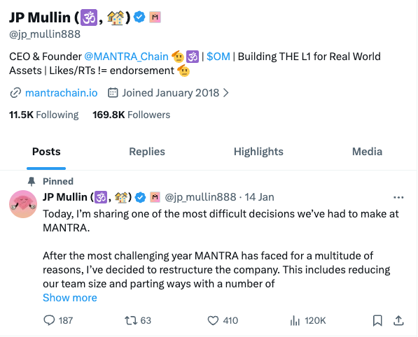 MANTRA, a real-world-asset-focused layer-1 blockchain, announced a company-wide restructuring with significant staff cuts after a brutal 2025 for its token, confirming the move in public statements by CEO John Patrick Mullin on Jan. 14, 2026.